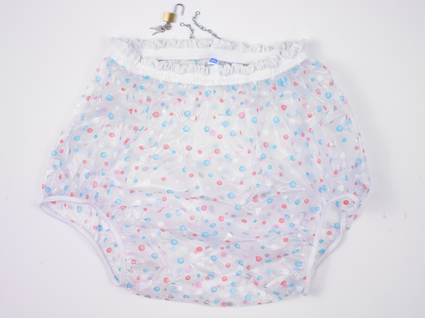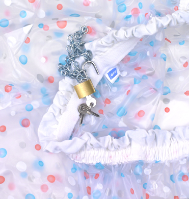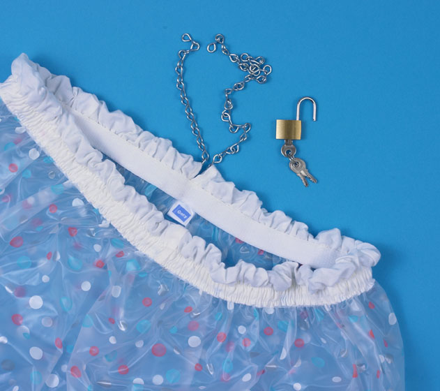 They are available in any of the plastic materials that Gary offers and there is a metal chain in a cloth band around the top with a padlock to deter the patient from taking them off.